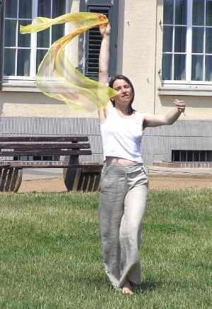 Der Tanzpädagoge Uwe Heller zeigte mit 20 tanzbegeisterten Menschen im 12ten Ausdruckstanzprojekt "tanzArt" eine Auseinandersetzung mit der Zeit und Tradition der Elizabeth-Duncan-Schule. Der Raum, die Kulisse, wie das gute "alte" Tuch, waren dabei Inspiration und Mittel die Bewegung umzusetzen, faszinierend der Kontrast zur Gründerzeitwelt, die in der ersten Szene dargestellt wurde. Es entstanden vertraute Bilder und Bewegungsskizzen, sicher auch neue Einsichten, aber auch andere Aussichten als vor 95 Jahren.